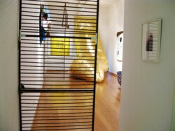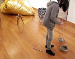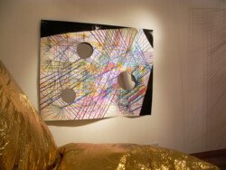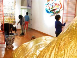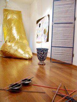 This exhibition brought together several different pieces. Visitors had to open a lightweight structure that, when moved, brushed against an object, generating a constant sound. Being located at the entrance of the room, interaction was inevitable. Upon entering the room, there were two more structures similar to the one at the entrance. The pieces formed a group of three “instruments,” each producing a different sound. Then, a large piece appeared, changing according to the weather conditions: a bag prepared with gift wrapping paper attached to the window, undergoing constant visual and auditory transformation. Several works were presented on the walls, representing three of the most frequent expressions in Juliana’s work: tree portraits, sound paintings, and works derived from her paper research. The artist has been folding, cutting, and weaving with paper for years. This ensemble aimed to immerse visitors in a space of subtle, inevitable, and permanent changes.