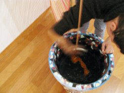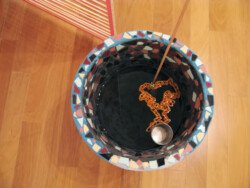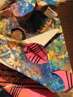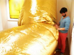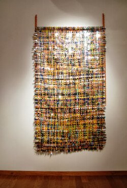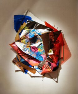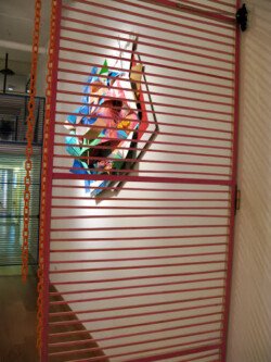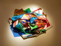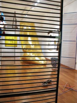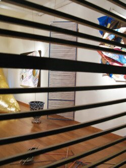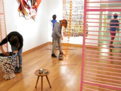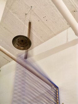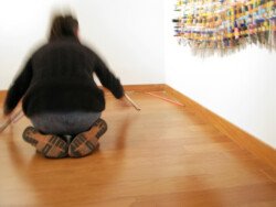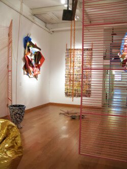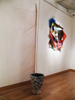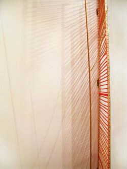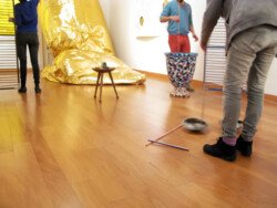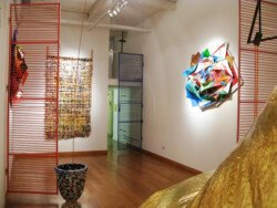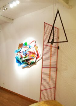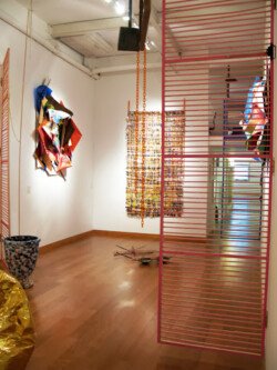 En esta muestra convivieron varias piezas distintas. Les visitantes tenían que abrir una estructura liviana que al moverla rozaba un objeto, generando un sonido constante. Al estar ubicada en la entrada de la sala, la interacción era inevitable. Luego, al ingresar a la sala, había dos estructuras más similares a la de la entrada. Las piezas conformaban un grupo de tres “instrumentos”, cada cual con un sonido diferente. Luego aparecía una gran pieza, cambiante según las condiciones del clima: una bolsa preparada con papel de regalo adherida a la ventana que estaba en constante transformación visual y sonora. En las paredes se presentaron varias obras que representan tres de las expresiones más frecuentes del trabajo de Juliana: retratos de árboles, pinturas de sonidos, y trabajos derivados de su investigación en papel. La artista hace años que pliega, corta y teje el papel en sus obras.