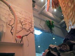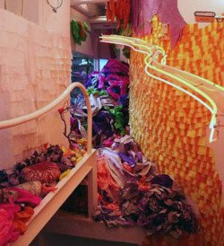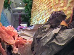 Para esta muestra utilicé, papeles, lisos y estampados, hilo, ramas y cola vinilica. Cubrí paredes, piso, y estanterías con el papel arrugado, atado, plegado o roto.