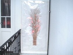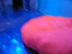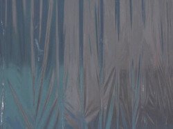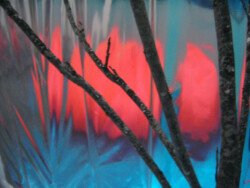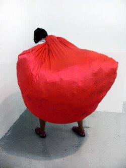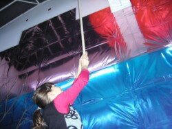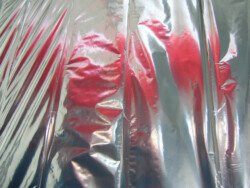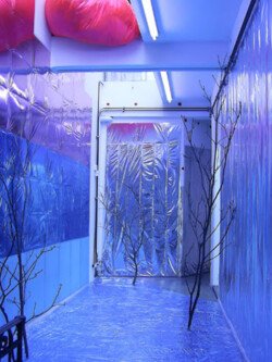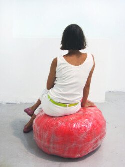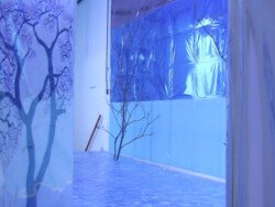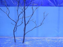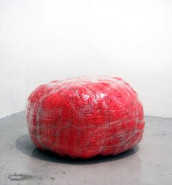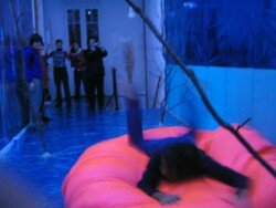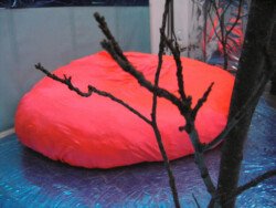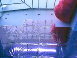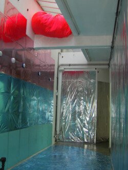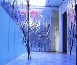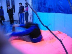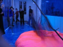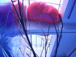 En esta muestra cubrí las paredes y el piso con papel metalizado celeste y papel mate del mismo color. Sobre la biga que atraviesa la sala por la parte superior, instalé un objeto de seda fucsia que coloreaba el espacio en el reflejo de los papeles. Durante los 30 días de exposición transforme la muestra con nueve acciones: la subida, luces, círculos rojos, la creciente, cuatro árboles, sombra, la caída, el peso de luz, roca.