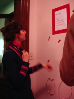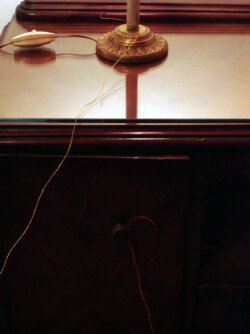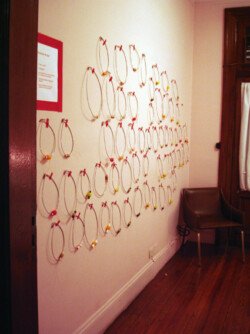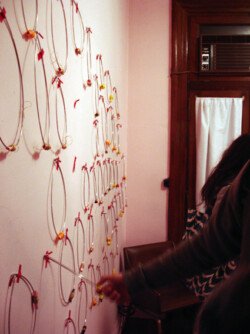Fue una de las primeras instalaciones en las que invité a participar a los visitantes. La sala era una habitación del hotel Boquitas Pintadas que abría sus puertas por última vez con esta muestra colectiva “No es fácil decir adiós”. en una de las paredes había colgados varios collares con un carrete de hilo dorado junto a ellos estaba un cartel que decía: