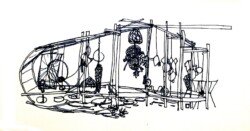 La pieza central de la muestra fue un instrumento hecho con objetos usados, sobrantes de madera y 7 pequeños motores. Cada elemento formo parte de un sistema en movimiento en el que las cosas rozaban, golpeaban o chocaban entre si formando un conjunto de sonidos cíclicos.