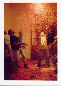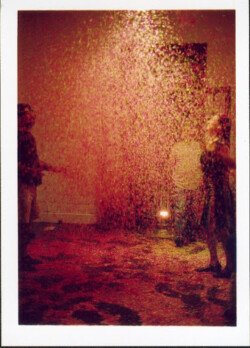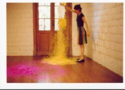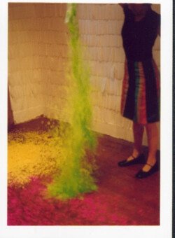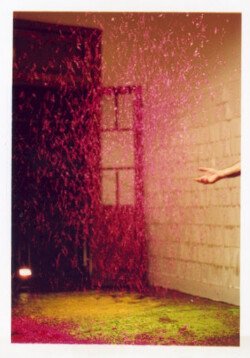Durante la inauguración los espectadores, mezclaron los colores. Al finalizar la muestra junté todo el material en una mochila y fui a un edificio en el centro de Bs. As., subí a la terraza, y desde ahí arroje todo el papel hacia la calle. Este fue mi primer lanzamiento.