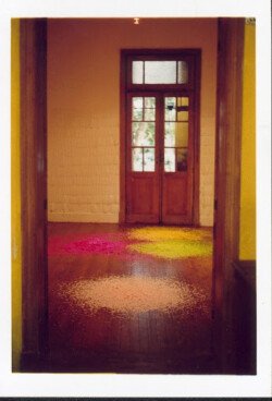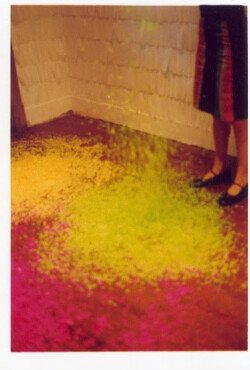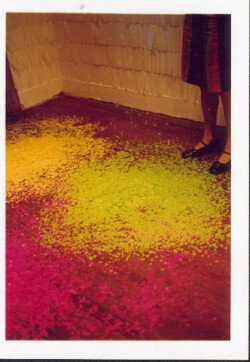 En el suelo de la sala había cuatro montículos de color, rosa, verde, fucsia y amarillo, formados por papel cortado en rectángulos muy pequeños.