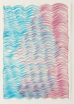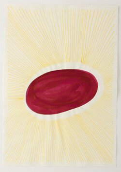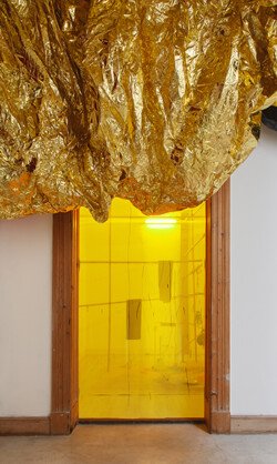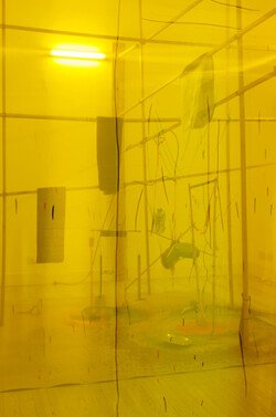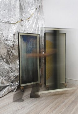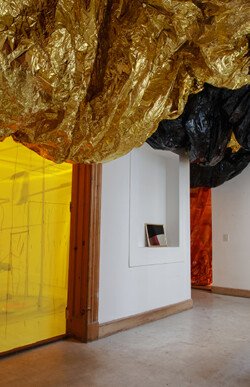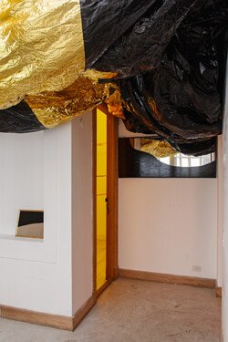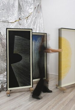 This exhibition allowed Juliana to bring together installations, drawings, paintings, and actions. From the entrance to the first room, the ceiling was adorned with a delicate and responsive body of gift wrapping paper. The initial view of the sound installation was veiled by a drawing arranged on a translucent yellow fabric, thus reinforcing the golden illumination of the room. This installation featured two motors that moved objects and powders, creating random drawings and sounds. The next room was entered by pulling a curtain that emerged from the ceiling, revealing 13 ink works and three rolling paintings mounted on the wall, arranged in the space and available to the visitors. In this room, two performances were held with paintings moved by performers who executed a specific choreography for each artwork. The first room immersed the viewer in mechanical and cyclical movements, while the other room challenged them to move the paintings according to their own will. The purpose of the entire exhibition was the interaction between these two experiences.