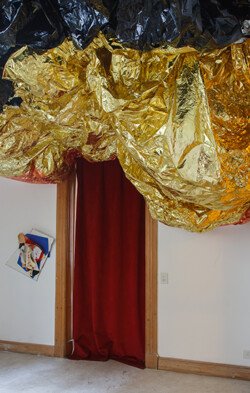 Juliana Iriart suele trabajar arrodillada, pero no reza. Trabaja así para ubicarse inmediatamente con respecto a los materiales. Su taller es muy chico. O más bien está lleno de cosas. Queda en la boca pero no por vocación acomodaticia con la geopolítica del arte sino por herencia familiar real. La atmósfera se la da un reflector y lo que destella de unas telas brillantes plegadas y colgadas del techo, como las que estructuran sin estructurar esta muestra. La otra luz es una vela misteriosa perdida en un rincón. Es tan trabajoso y demanda tanta energía ser uno mismo…
