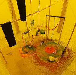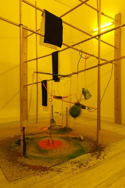 Cuatro maderas con forma de pilote, una en cada pared, que sostienen unas varillas transversales a la sala, una especie de laberinto que sostiene unos motores que sostienen unos alambres que a su vez sostiene pinceles, manijas de canillas, plumas, martillos, látigos y soguitas. Esos objetos tocan pigmentos en polvo y lentejuelas que se esparcen azarosamente por el suelo de la habitación. Si se la mira fija no dan ganas de entrar, un poco de ruido y tanto color espanta al visitante, que no está preparado para que la tecnología sea tan frágil. No puede ser que dependa de una serie de materias. Digamos que es un elemento más, un pormenor en el orden y un pedazo de asfalto recién destruido que intenta quedar adherido a las personas.