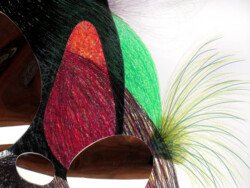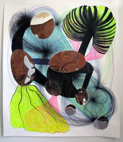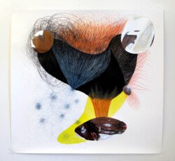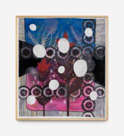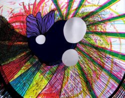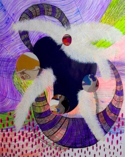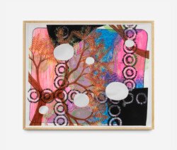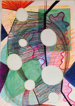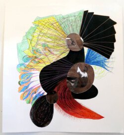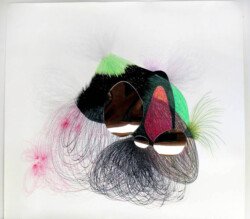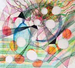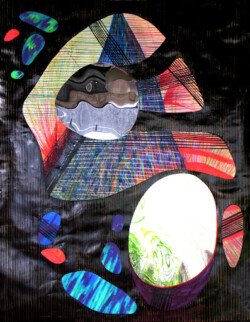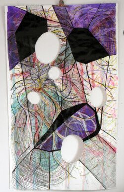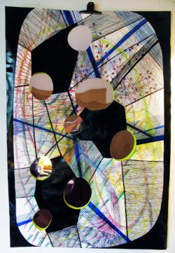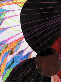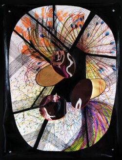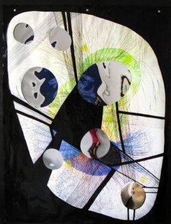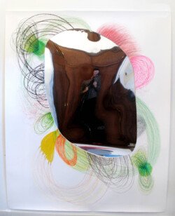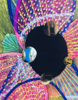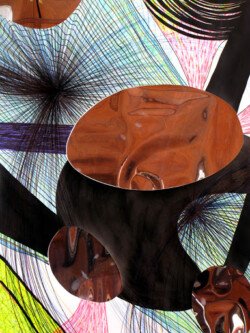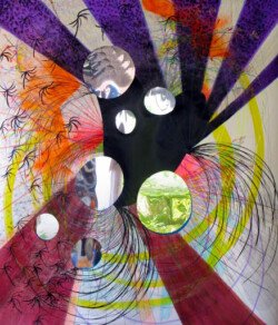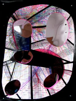 Tinta, acrílico, pastel y lápiz sobre papel calado con fondo de lámina espejada.