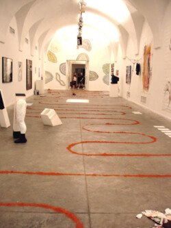 La primera imagen del trabajo es una línea que serpentea todo el piso formando un zigzag de pared a pared por el lado más angosto de la sala y a lo largo de las dos salas que ocupan la muestra. La distancia entre una línea y la otra es de 70 cm aprox.